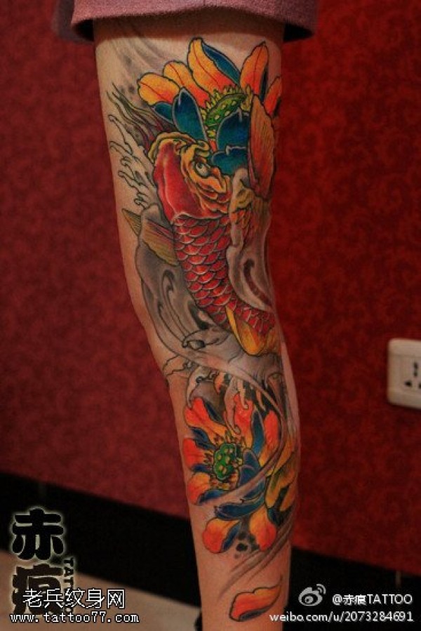 传统鲤鱼花小腿纹身_腿部纹身图案大全_纹身图吧