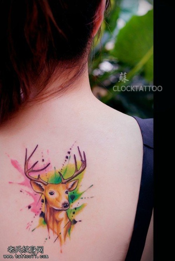 女性背部彩色羚羊文身作品由文身分享