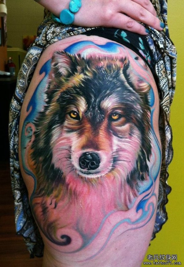 腿部霸气很酷的欧美彩色狼头纹身图案