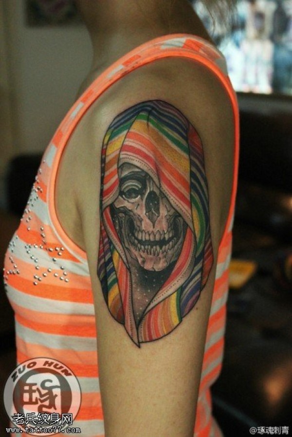 纹身图吧分享一张手臂欧美彩色骷髅文身作品