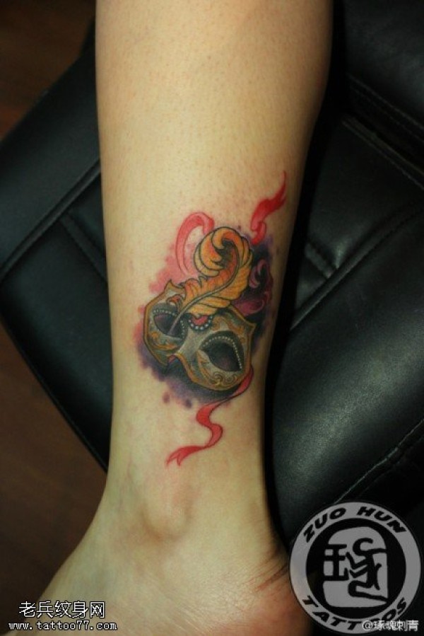 女性脚踝彩色面具文身作品