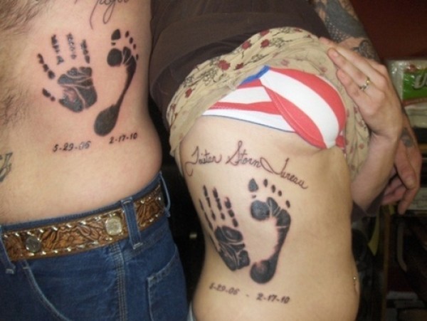 一对情侣腰部掌印和脚印组合的图腾纹身图案