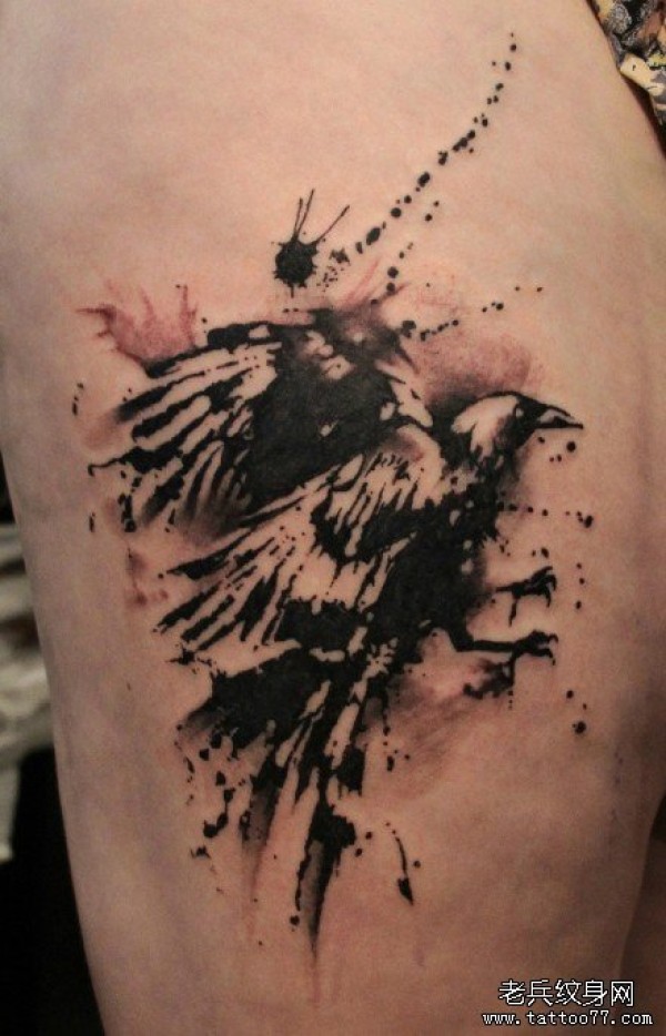 一款潮流经典的水墨风格的乌鸦纹身图案