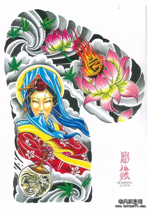 日式老传统之一款时尚漂亮的半胛美女莲花梵文树叶纹身图案