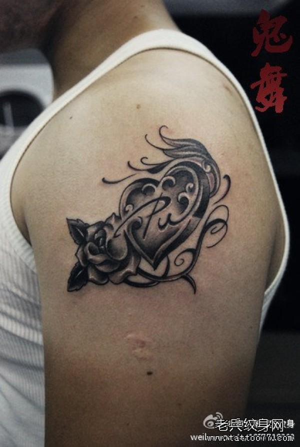 男生手臂潮流经典的爱心与玫瑰纹身图案