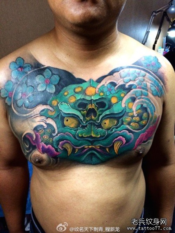 男人前胸很酷时尚的唐狮子纹身图案