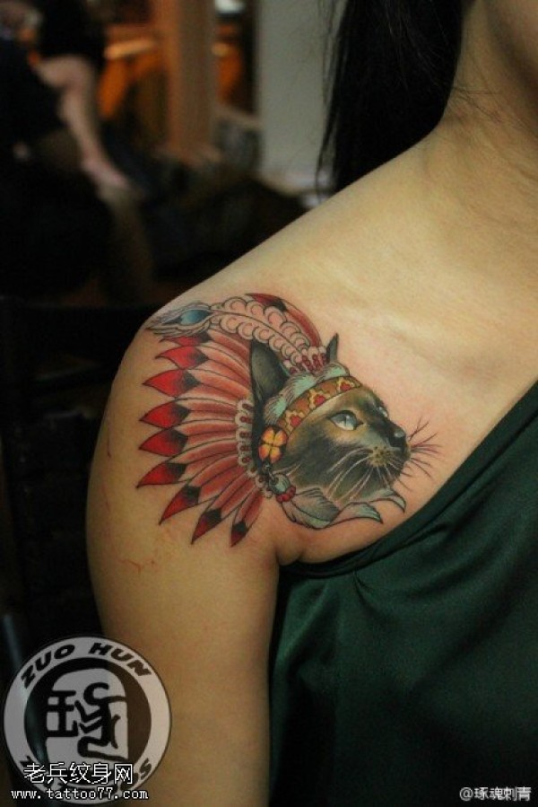 女性肩部彩色猫咪文身作品