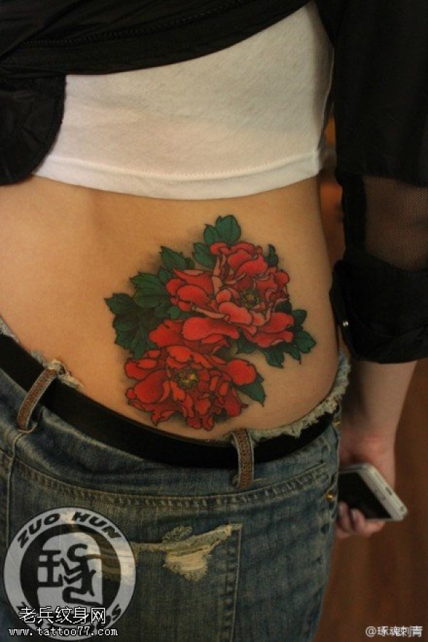 女性腰部彩色牡丹文身作品由纹身图吧分享