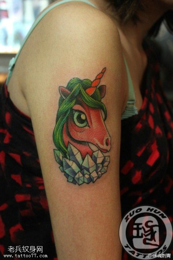 女性手臂彩色独角兽宝石文身作品由纹身图吧分享