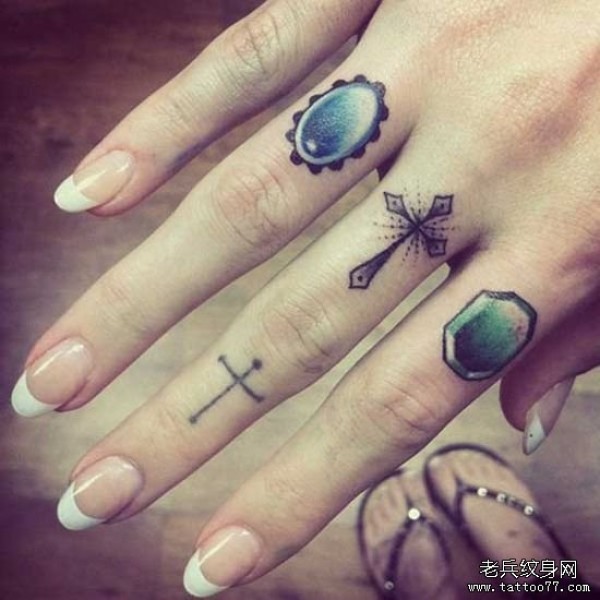 为您分享手指纹身之十字架宝石纹身图案作品图片