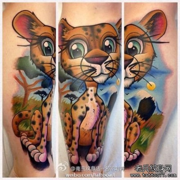 腿部潮流经典的一款欧美风格的小豹子纹身图案