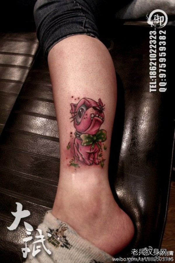 女生腿部可爱的卡通小狗纹身图案
