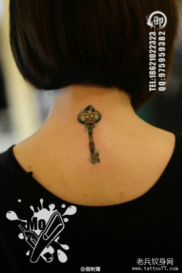 女生后脖子小巧时尚的钥匙纹身图案
