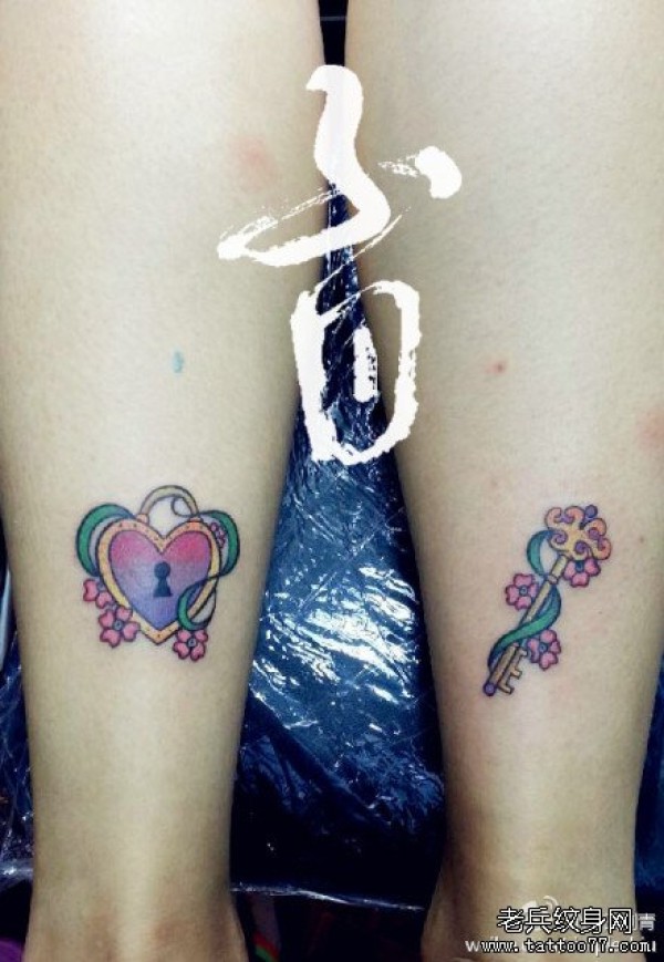 女生腿部精美的情侣爱心锁与钥匙纹身图案