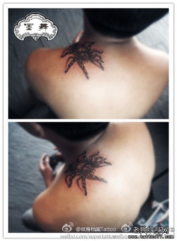 肩膀处精美潮流的黑灰蜘蛛纹身图案