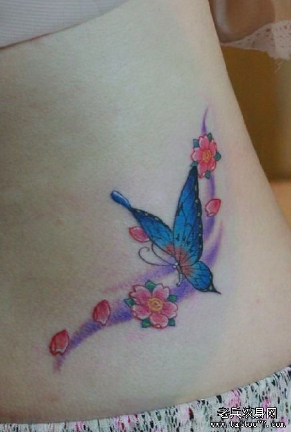 美女腰部精美艳丽的蝴蝶与樱花纹身图案