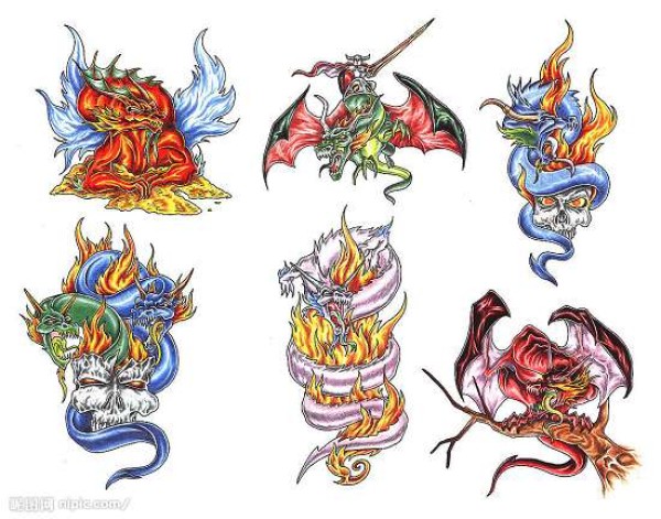卡通纹身图案:欧式龙火焰骷髅纹身图案