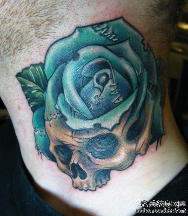 男生脖子处时尚经典的玫瑰骷髅纹身图案