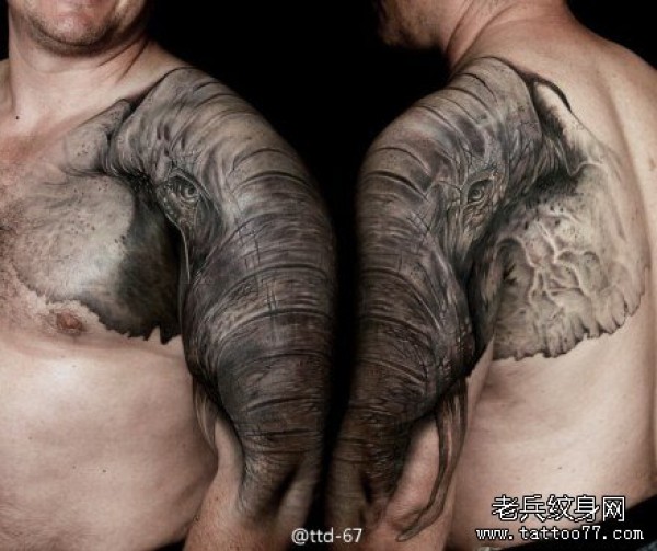 男人手臂与肩膀处超酷大象纹身图案