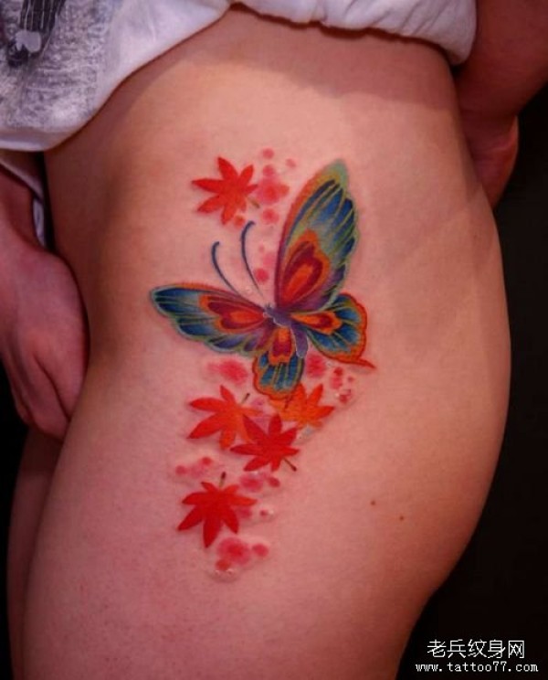 一款美女腿部漂亮的彩色蝴蝶枫叶纹身图案