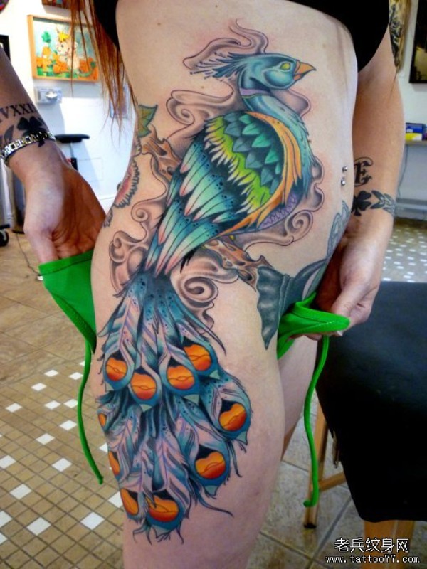 美女侧腰一款性感漂亮的孔雀纹身图案