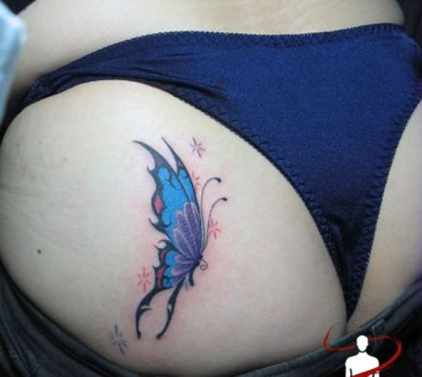 美女生感时尚臀部彩色蝴蝶纹身图案