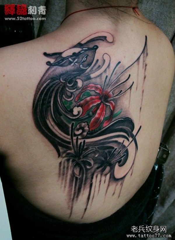 女生后肩背经典潮流的狐狸与彼岸花纹身图案
