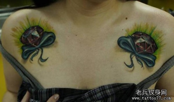 美女肩膀处漂亮的蝴蝶结与钻石纹身图案