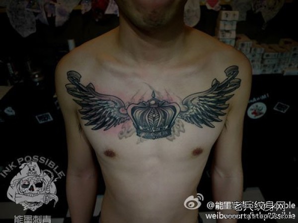 男人前胸帅气超酷的皇冠与翅膀纹身图案