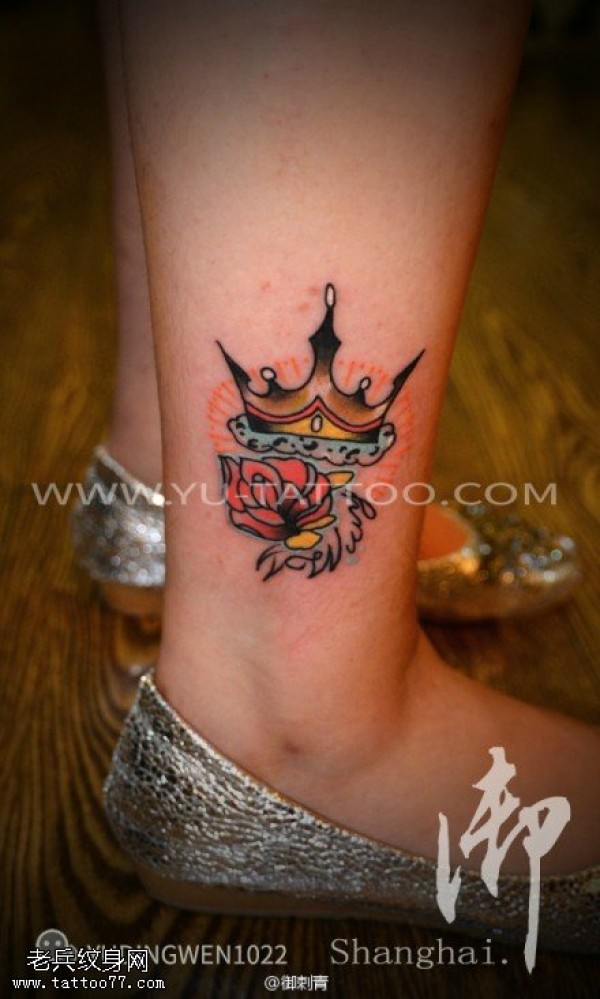 女生脚踝彩色皇冠玫瑰花纹身图案