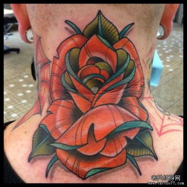 脖子上一款欧美玫瑰花纹身图片欣赏