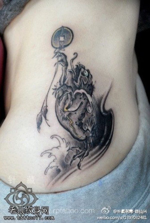 腰部黑灰金蟾纹身图案