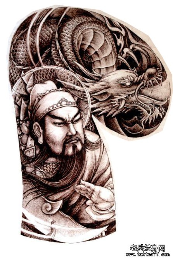 纹身吧分享的男人气最高的半胛关公降龙纹身手稿图案