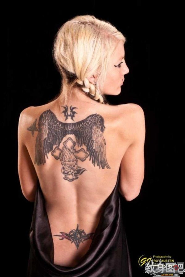 金发美女后背上的翅膀纹身作品图片