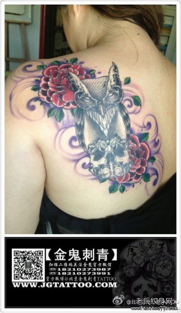 女生后背经典潮流的猫头鹰纹身图案