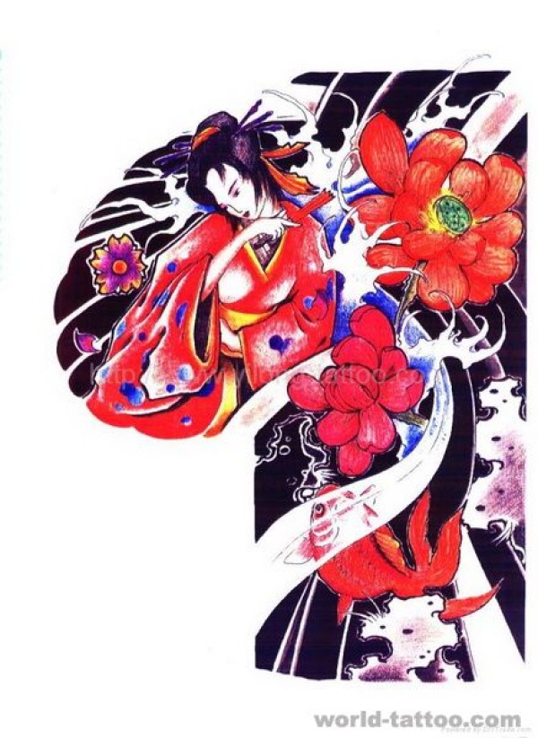 日本纹身图案之日式老传统半胛美女莲花纹身手稿作品图片