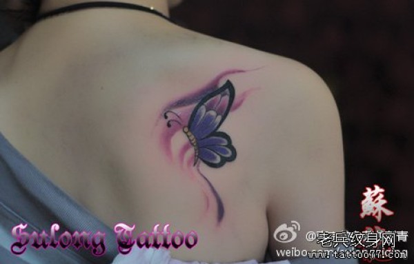 女生肩背漂亮的彩色蝴蝶纹身图案