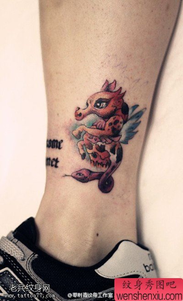 女生脚踝彩色海马纹身图案