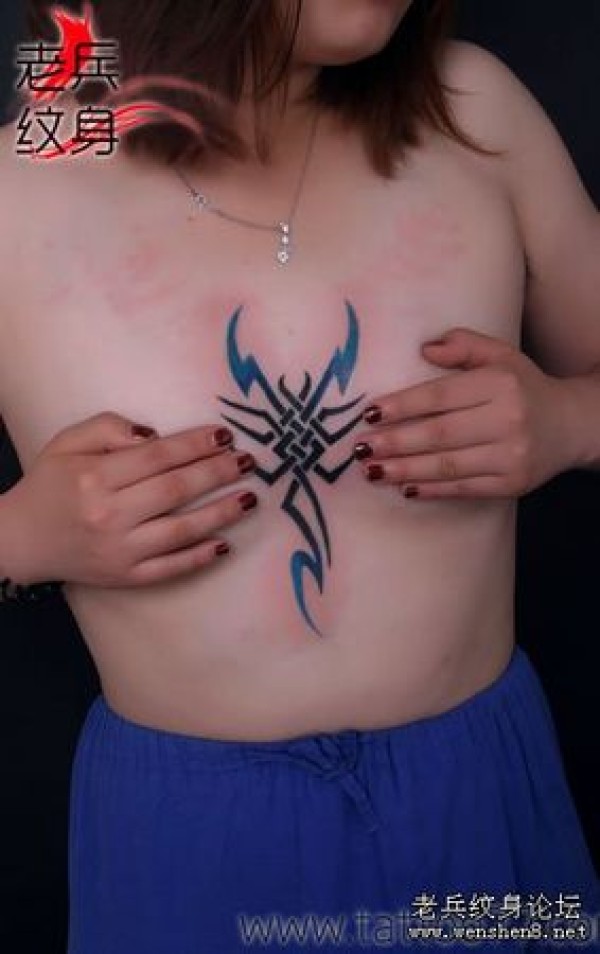 一款另类性感美女胸部彩色图腾蝎子纹身图案