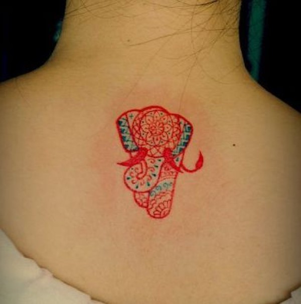 女孩子背部好看的彩色图腾大象纹身图案