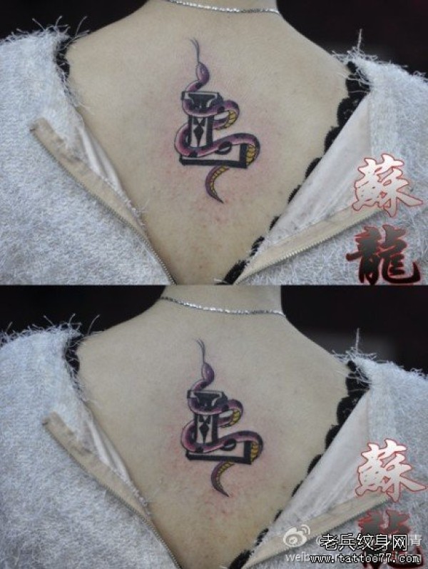 女生背部小蛇与字母纹身图案