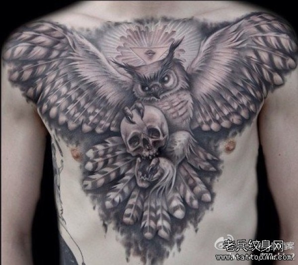 男人前胸超帅的黑灰猫头鹰纹身图案