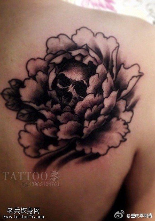背部玫瑰花骷髅纹身图案