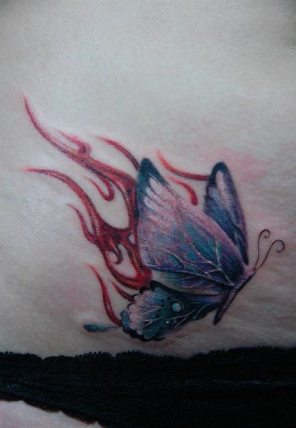 腹部好看时尚的蝴蝶火焰纹身图案