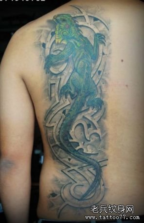 男人背部一款彩色蜥蜴纹身图案