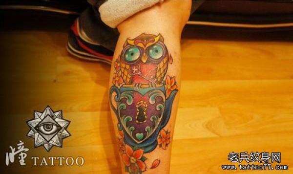 腿部帅气潮流的猫头鹰纹身图案
