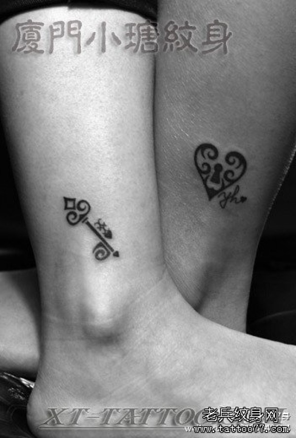 腿部时尚时尚的情侣钥匙与爱心锁纹身图案