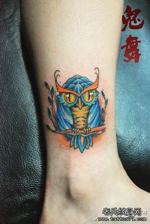 女生腿部潮流时尚的小猫头鹰纹身图案