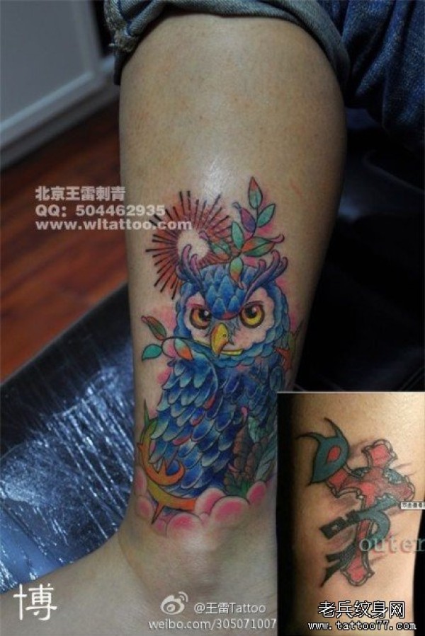 女生腿部时尚漂亮的彩色猫头鹰纹身图案