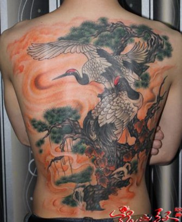 好看的满背白鹤仙鹤纹身图案